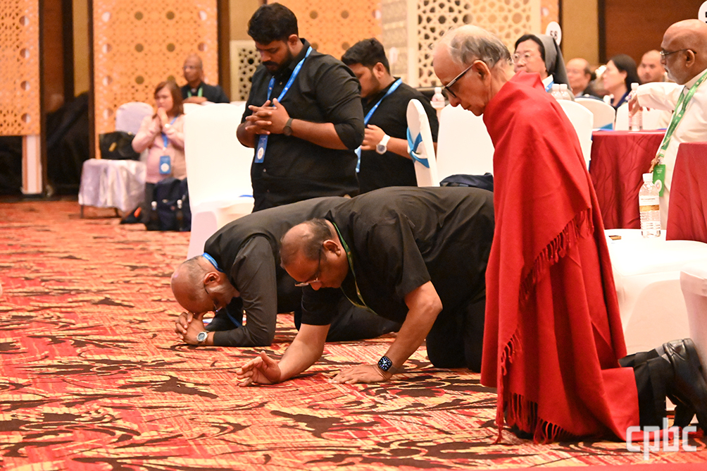 FABC 희망의 대순례 참가자들이 바닥에 무릎을 꿇고 성체 조배를 하고 있다.