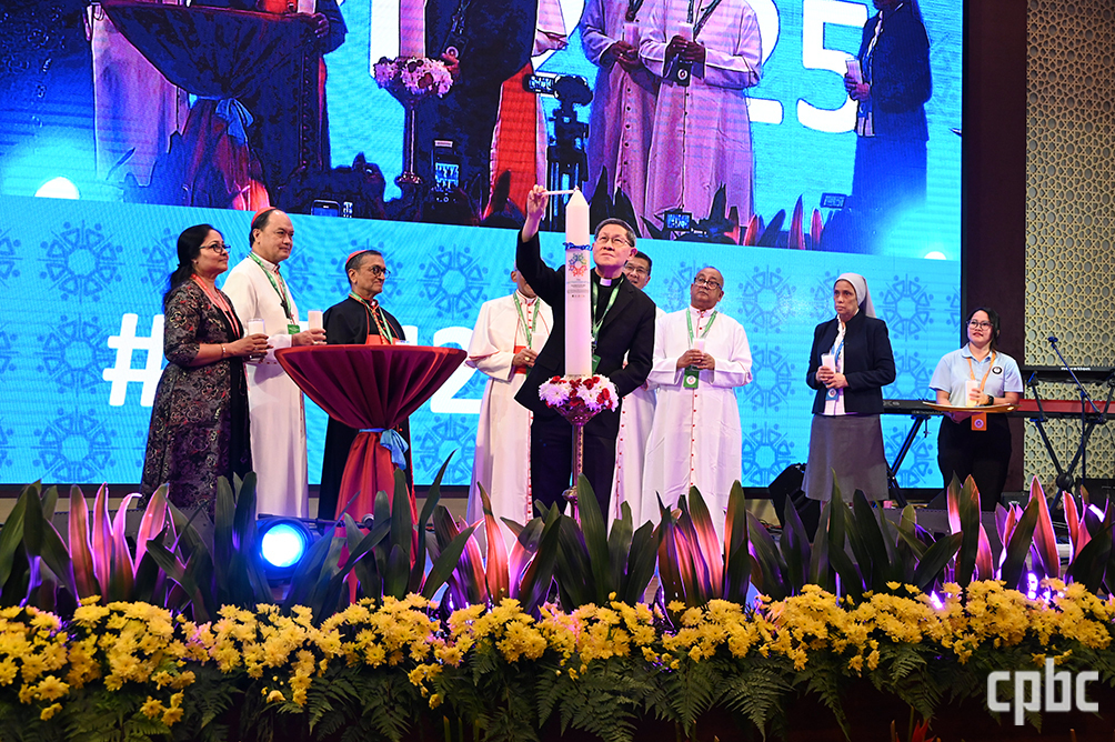교황청 복음화부 첫 복음화와 신설 개별교회부서 장관 직무 대행 루이스 안토니오 고킴 타글레 추기경이 11월 27일 말레이시아 페낭 라이트 호텔에서 FABC 희망의 대순례 개막을 알리며 초에 불을 붙이고 있다.
