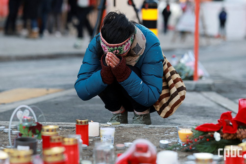 스위스 스키 리조트 화재 참사 다음날인 2일 한 시민이 사고가 발생한 술집 ‘르 콩스텔라시옹’ 앞에서 눈물을 흘리며 기도하고 있다. OSV