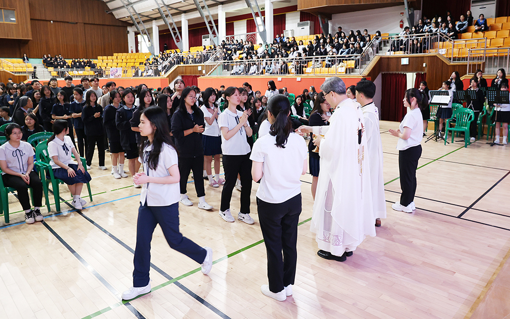 광주대교구장 옥현진 대주교가 2025년 5월 7일 광주 살레시오여중·고에서 학생들과 부활대축일 미사를 봉헌하며 성체를 분배하고 있다. 광주대교구 홍보실 제공