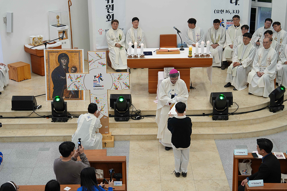 광주대교구장 옥현진 대주교가 2025년 11월 8일 교구청 성당에서 봉헌한 '2027 서울 세계청년대회 광주대교구대회 발대미사'에서 한 학생으로부터 십자가 조각을 전달받고 있다. 광주대교구 홍보실 제공