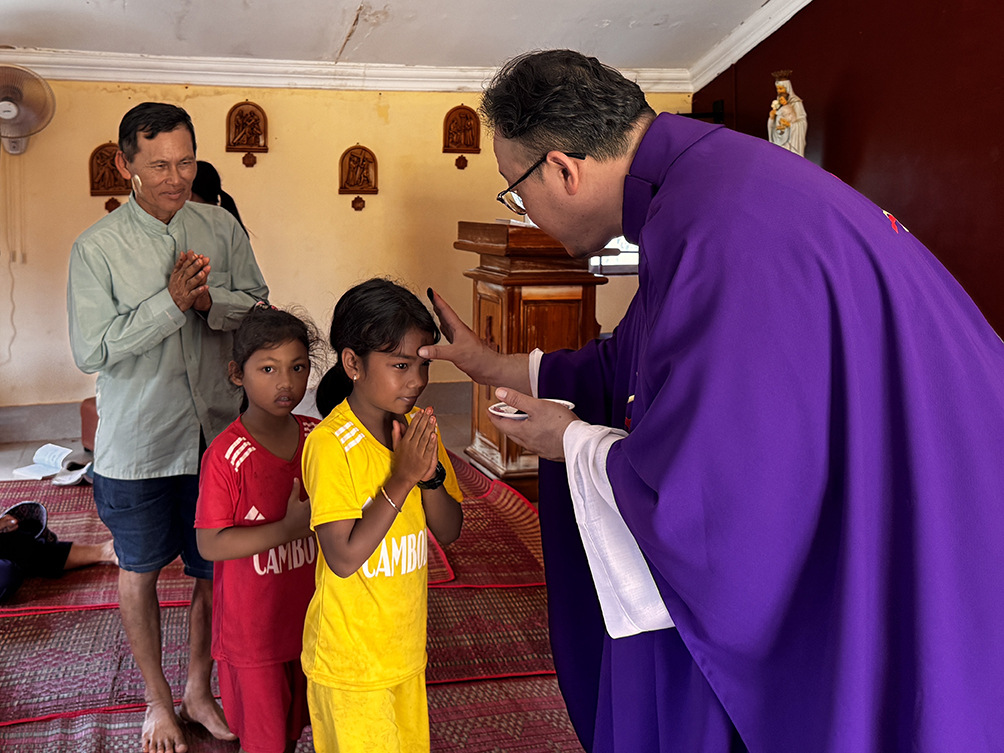 한국외방선교회 윤대호 신부가 2025년 재의 수요일 캄보디아의 쁘렉쁘로마을 아이들의 이마에 재를 바르고 있다. 윤대호 신부 제공