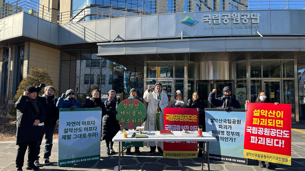 가톨릭기후행동은 12월 31일 강원 원주 국립공원공단 본사 앞에서 “설악산 케이블카 사업 시행 허가 기간을 연장한 것은 생태계와 미래 세대를 파괴하는 죄악”이라고 규탄했다.