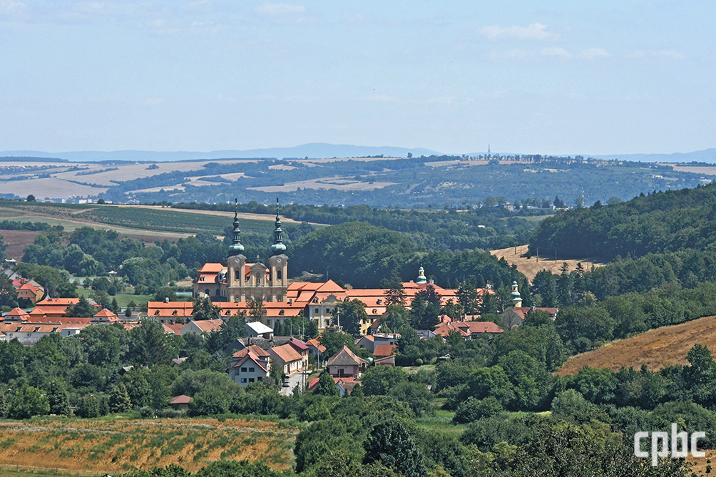마을로 가까워질수록 풍경이 차분해집니다. 창밖에는 낮은 구릉과 들판, 모라비아 특유의 완만한 지형이 이어집니다. 도로 끝에 밝은 색조의 성당 쌍탑과 수도원 건물이 시야에 들어옵니다.