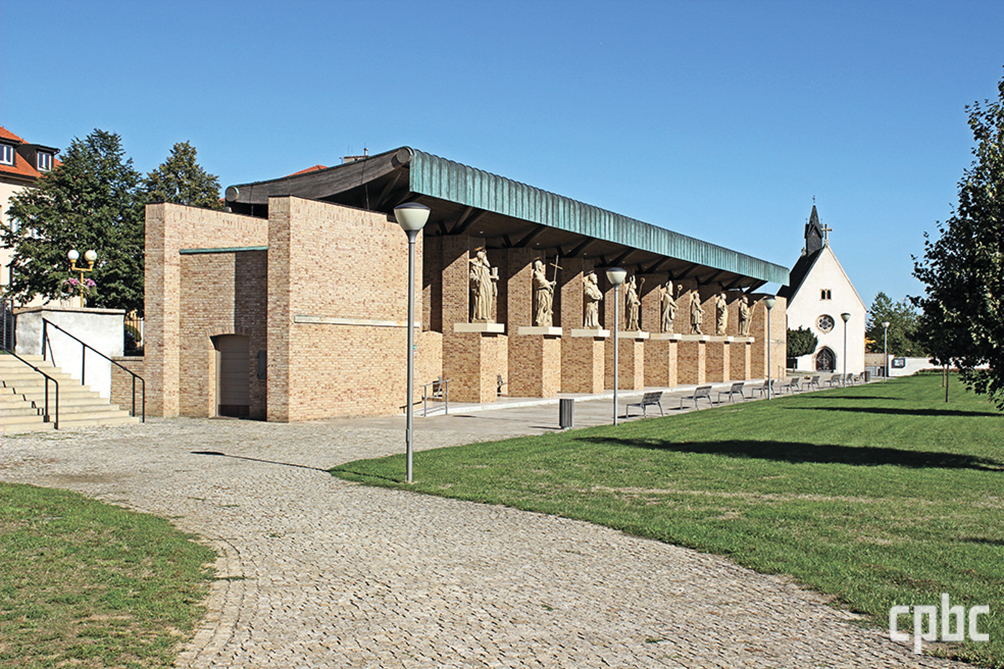 벨레흐라드 수도원 마당 북쪽 담장에 조성된 ‘성인들의 갤러리’. 길이 70m 높이 6.5m의 벽돌 감실 8칸에 17세기 말 준바실리카 정면에 있던 성 베네딕도와 클레르보의 성 베르나르도, 사도 성 베드로와 성 바오로, 성 치릴로와 성 메토디오 조각상을 성당 마당으로 옮겨 순례로를 따라 쌍으로 배치했다. 하얀 건물은 교회 일치의 상징으로 동방 전례를 위한 이코노스타시스가 설치된 주님 공현 소성당인 ‘치릴카’이다.