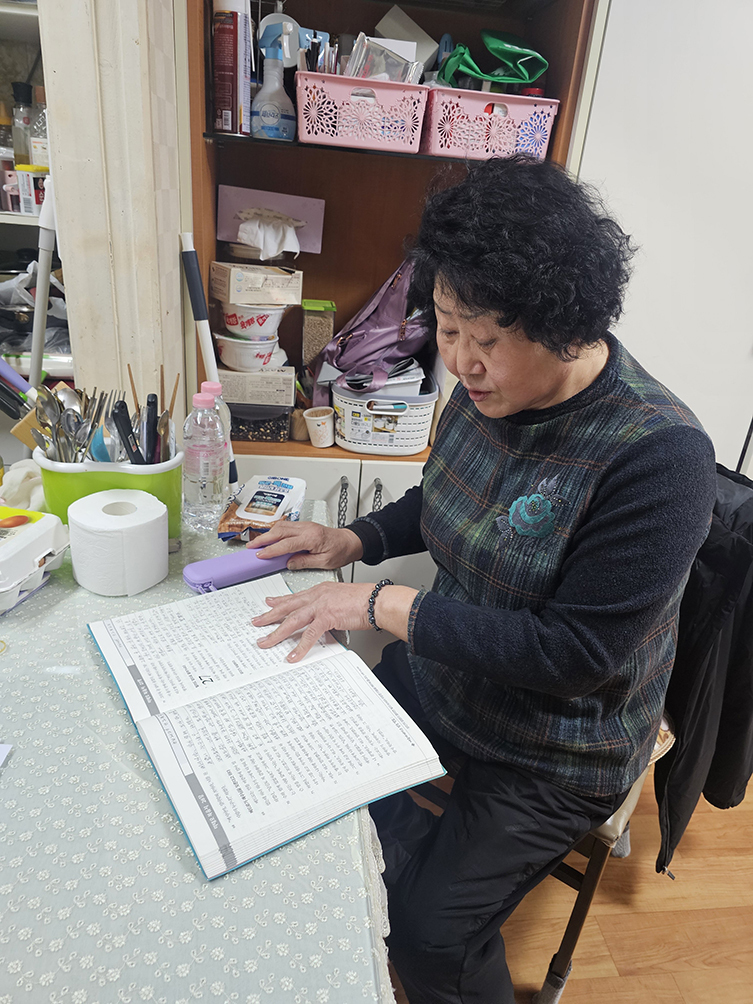 최근 인공관절 수술을 받은 전재순씨는 거동이 불편한 상황에서도 매일 성경쓰기를 하고 있다.